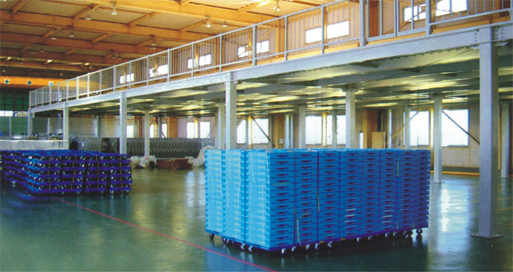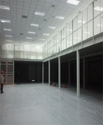 组合式钢平台,主要由立柱、主梁、次梁、楼板、楼梯及护栏组成,将空间分为两层,用于办公或存储。