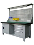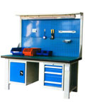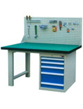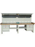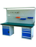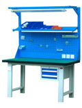 工作台;采用钢板折弯和型材结构,可载重1000kg。多种工作桌面,可满足不同的使用要求,可加装工具柜,台虎钳,百叶挂板,方孔挂板,灯具及电源等附件。颜色可选,可非标订做不同规格。